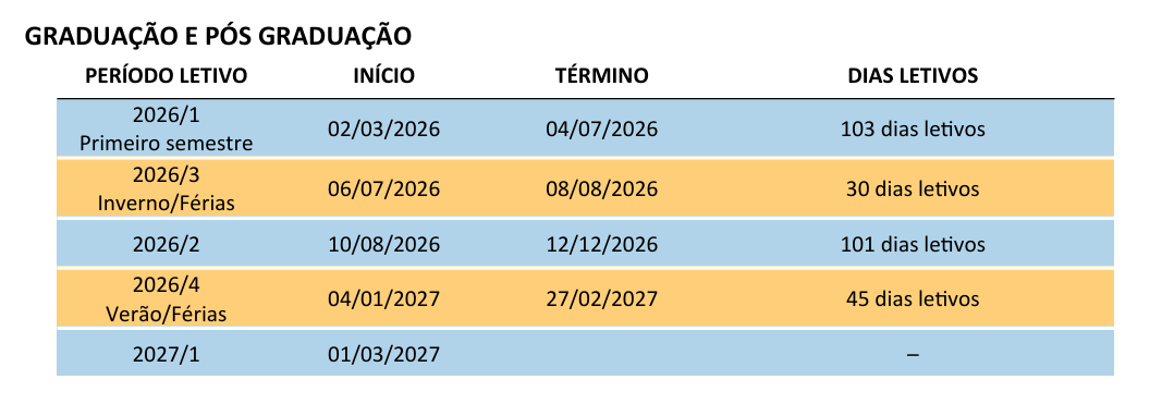 | 02/03 | INÍCIO DAS AULAS DE 2026/1 DA GRADUAÇÃO. |